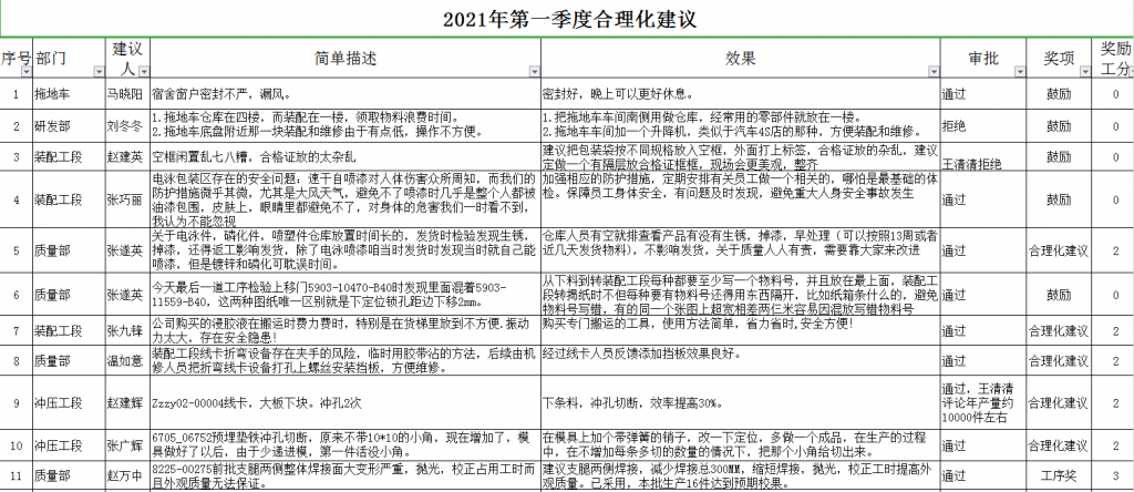 在中岳機電2021年第一季度合理化建議中